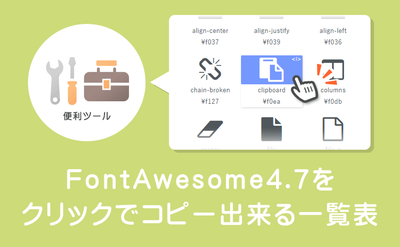 Cocoonの公式サイト(ブログ?)にて紹介されていたのですが、こちらのサイトさんでFont Awesomeのアイコンフォントを一覧化してワンクリックでコードをコピペできるように提供してくださっています。