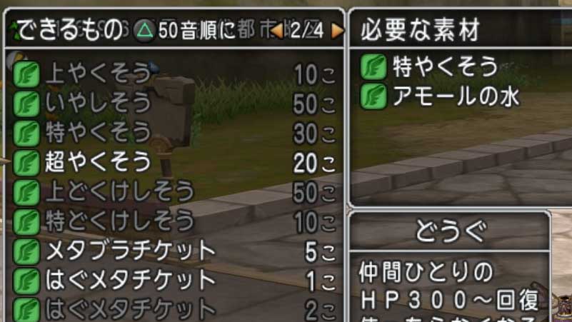 錬金釜のレシピを見ると超やくそう作るのに必要な素材は特やくそうとアモールの水。